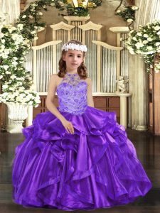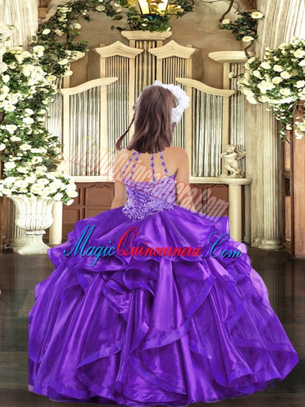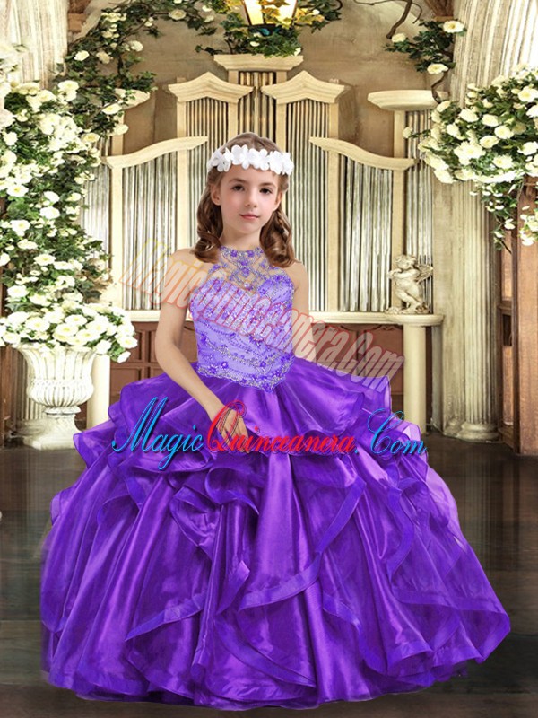 Purple Ball Gowns High-neck Sleeveless Organza Floor Length Lace Up Beading and Ruffles Girls Pageant Dresses