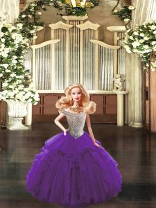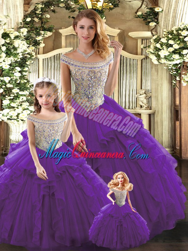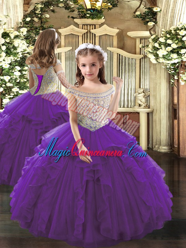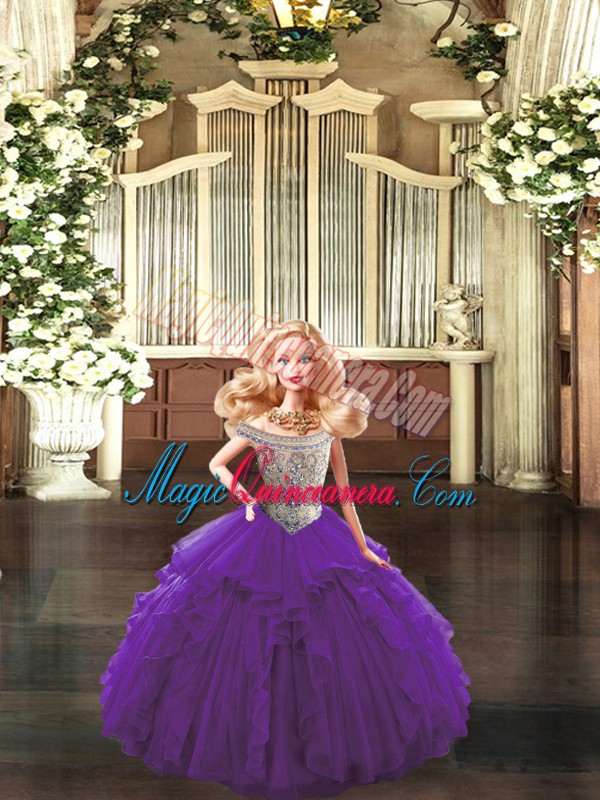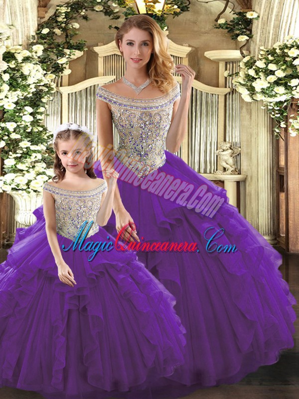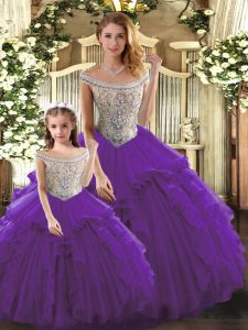 Purple Ball Gowns Tulle Bateau Sleeveless Beading and Ruffles Floor Length Lace Up Quinceanera Gown