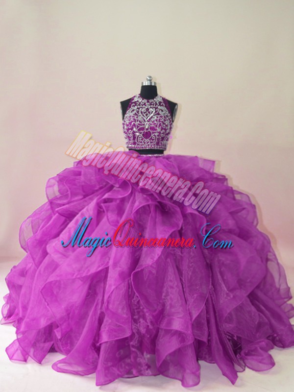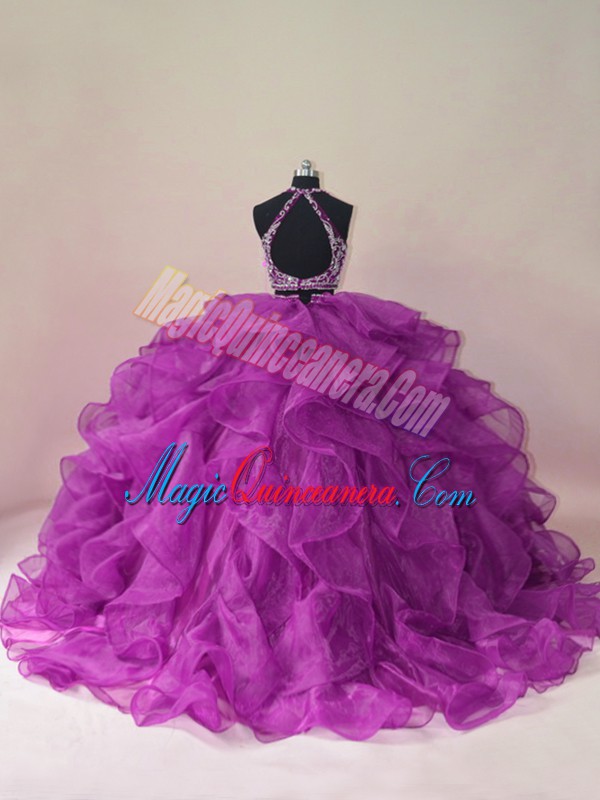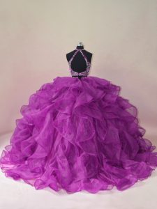Purple Halter Top Backless Beading and Ruffles Ball Gown Prom Dress Brush Train Sleeveless