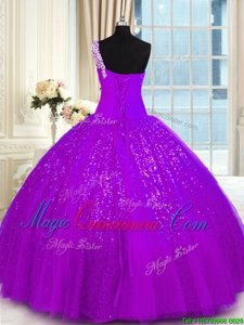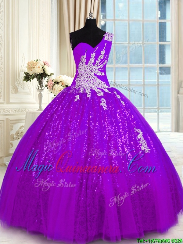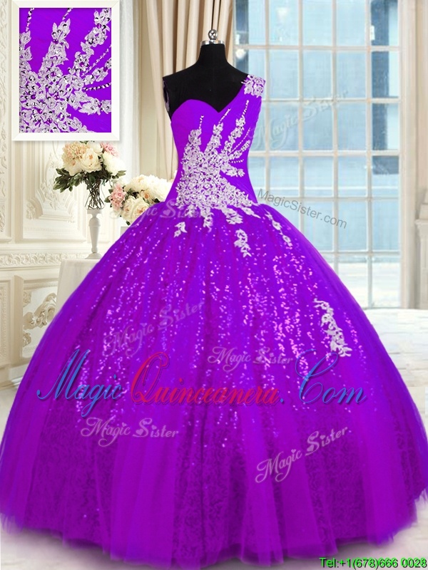 , Purple One Shoulder Lace Up Appliques Sweet 16 Dress Sleeveless