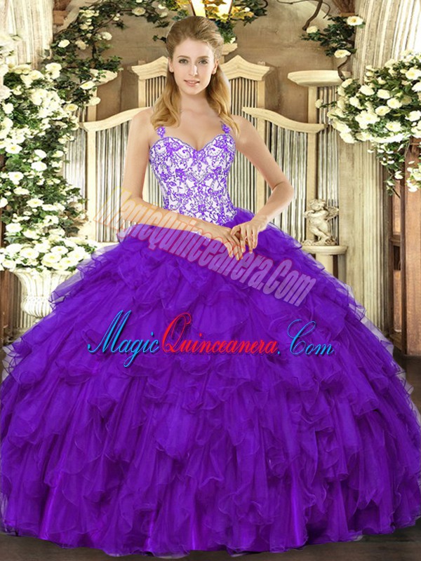 Purple Sleeveless Beading and Ruffles Floor Length Quince Ball Gowns