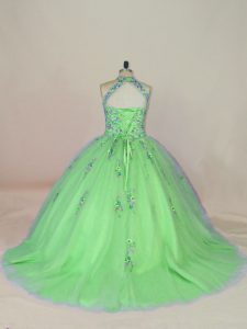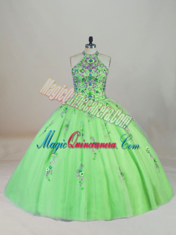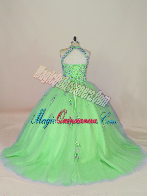 Quinceanera Gown Sweet 16 and Quinceanera with Appliques and Embroidery Halter Top Sleeveless Brush Train Lace Up