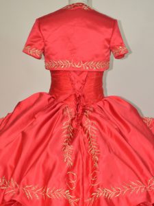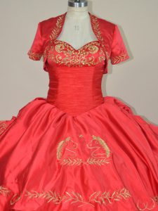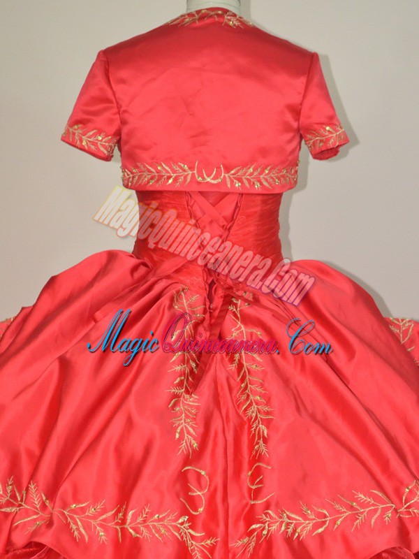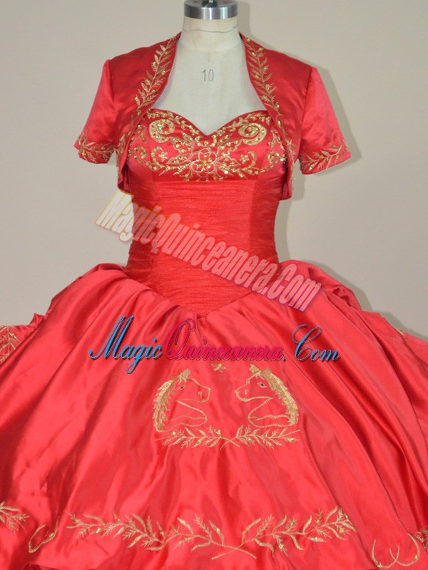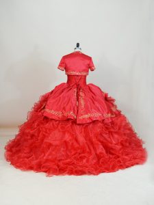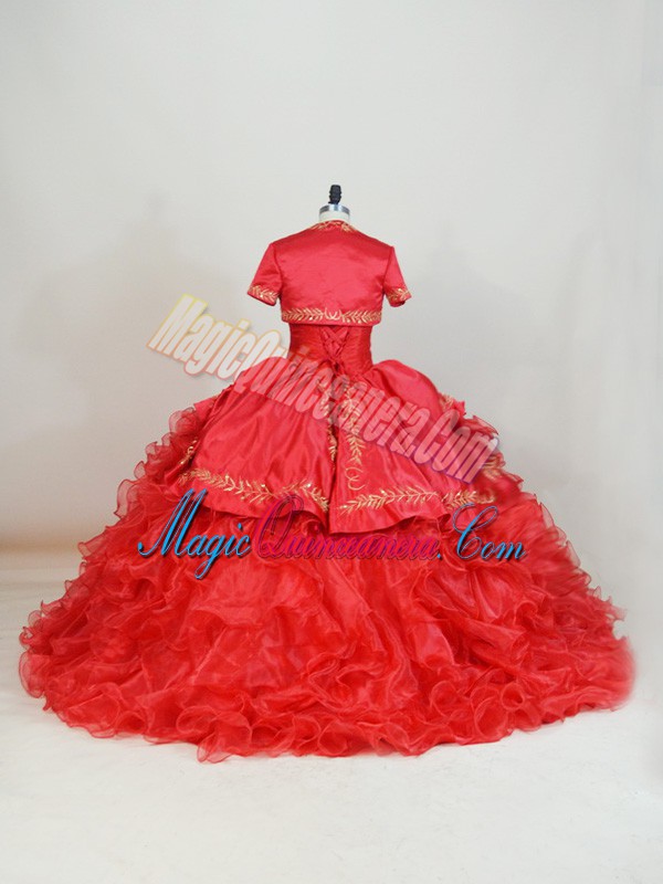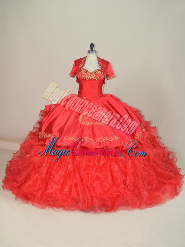 Red 15th Birthday Dress Sweet 16 and Quinceanera with Embroidery and Ruffles Sweetheart Sleeveless Brush Train Lace Up