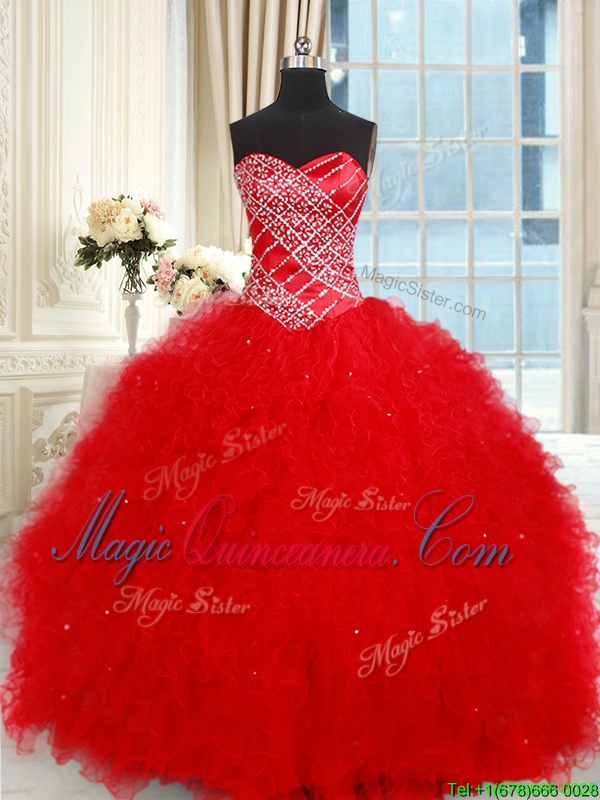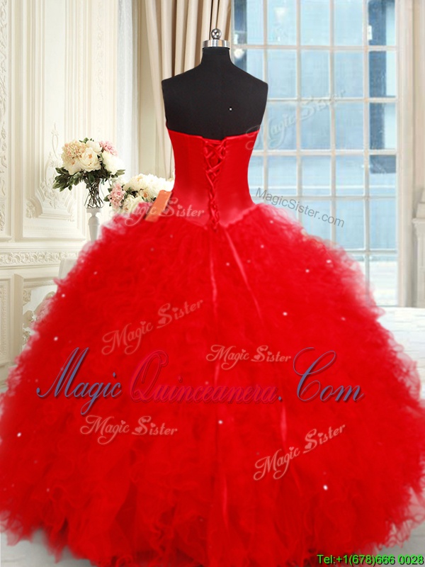 Red Ball Gown Prom Dress Military Ball and Sweet 16 and Quinceanera and For with Beading and Ruffled Layers Sweetheart Sleeveless Lace Up