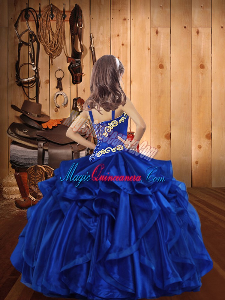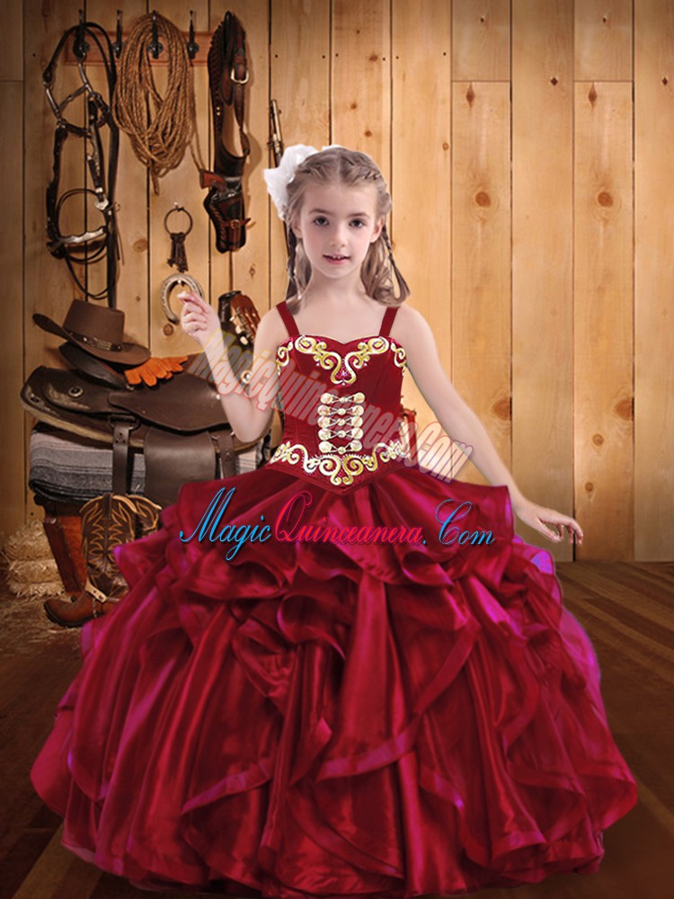 Red Ball Gowns Organza Straps Sleeveless Embroidery and Ruffles Floor Length Lace Up Kids Formal Wear