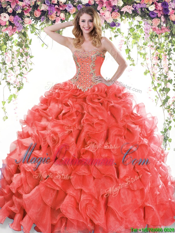 Red Ball Gowns Sweetheart Sleeveless Organza Sweep Train Lace Up Beading and Ruffles Vestidos de Quinceanera