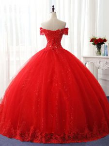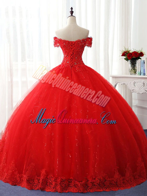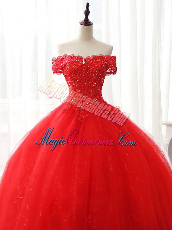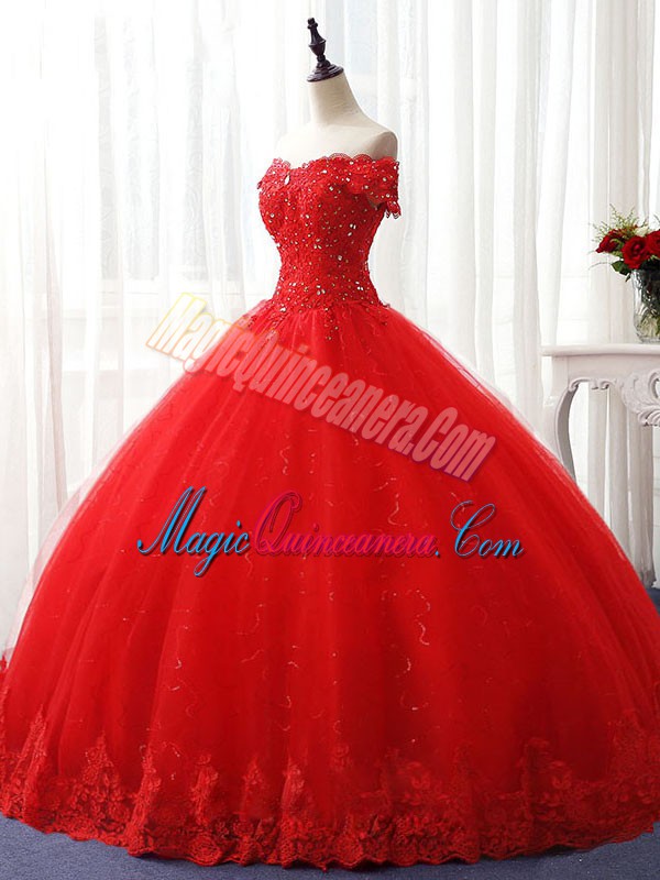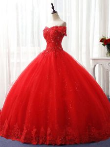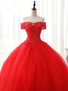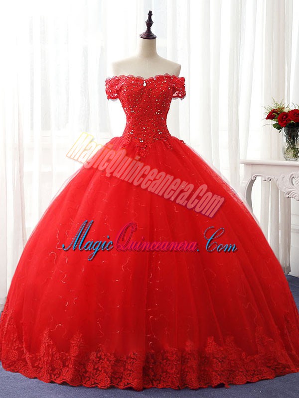 Red Ball Gowns Tulle Off The Shoulder Sleeveless Beading and Ruffles Floor Length Lace Up Quinceanera Gown