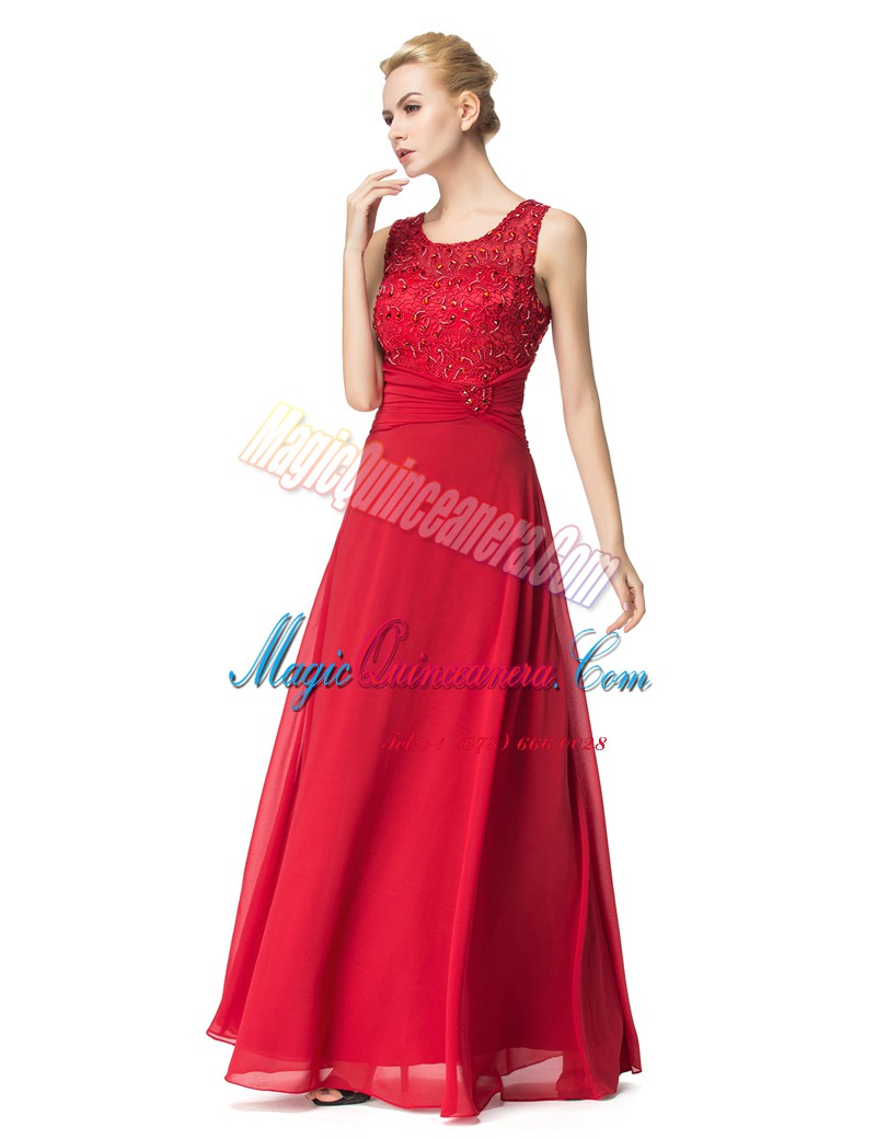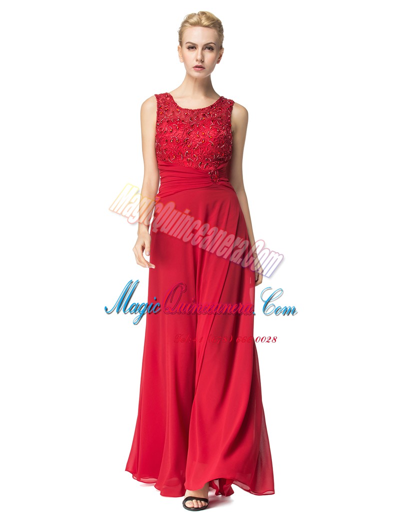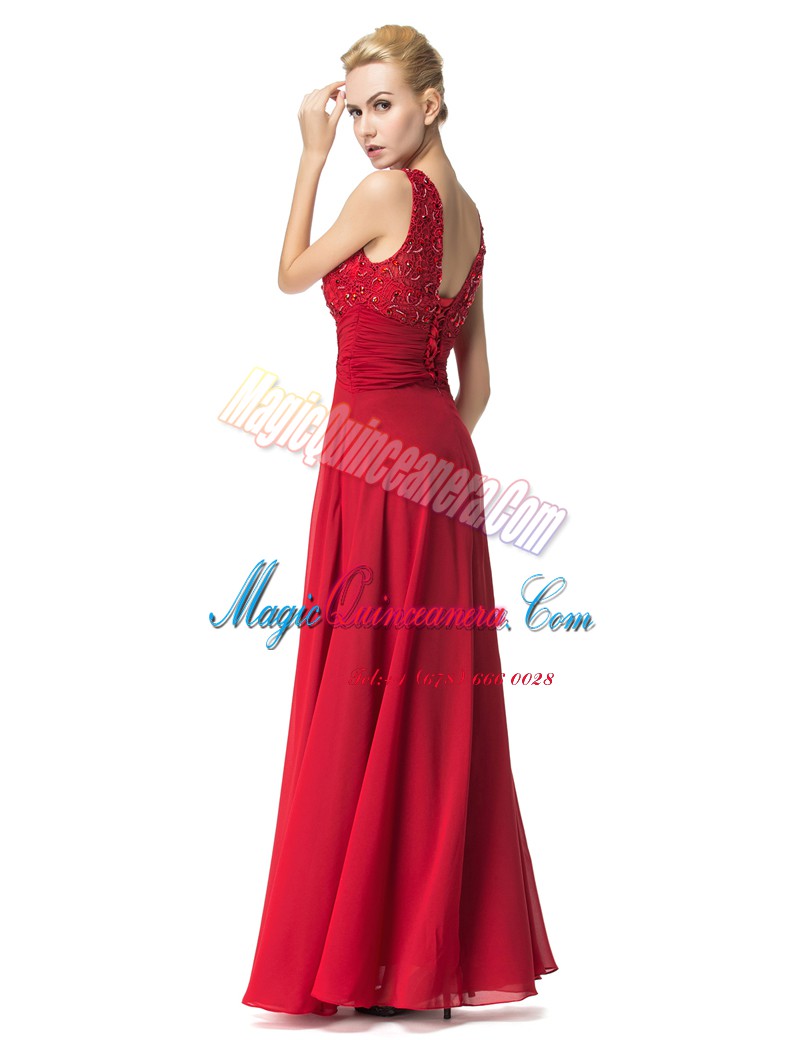 Red Column/Sheath Scoop Sleeveless Chiffon Floor Length Lace Up Beading and Ruching Prom Gown