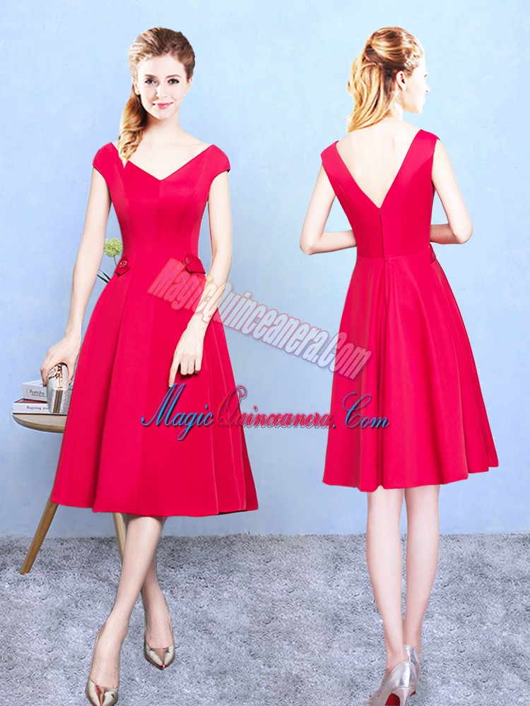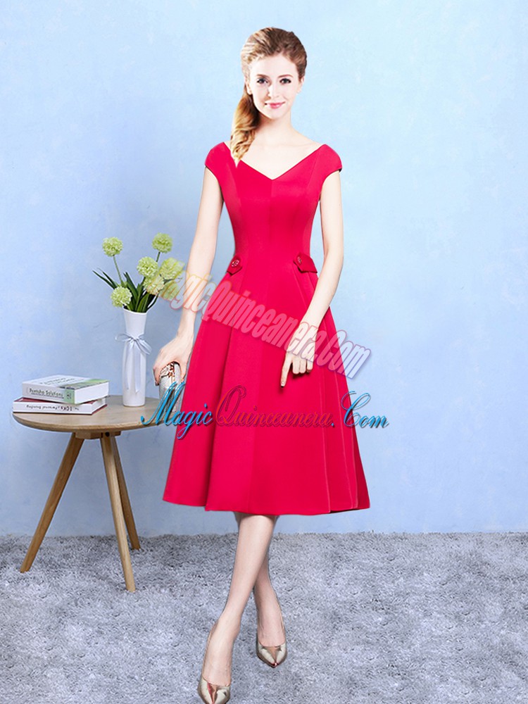 , Red Empire Satin V-neck Cap Sleeves Ruching Tea Length Zipper Quinceanera Dama Dress