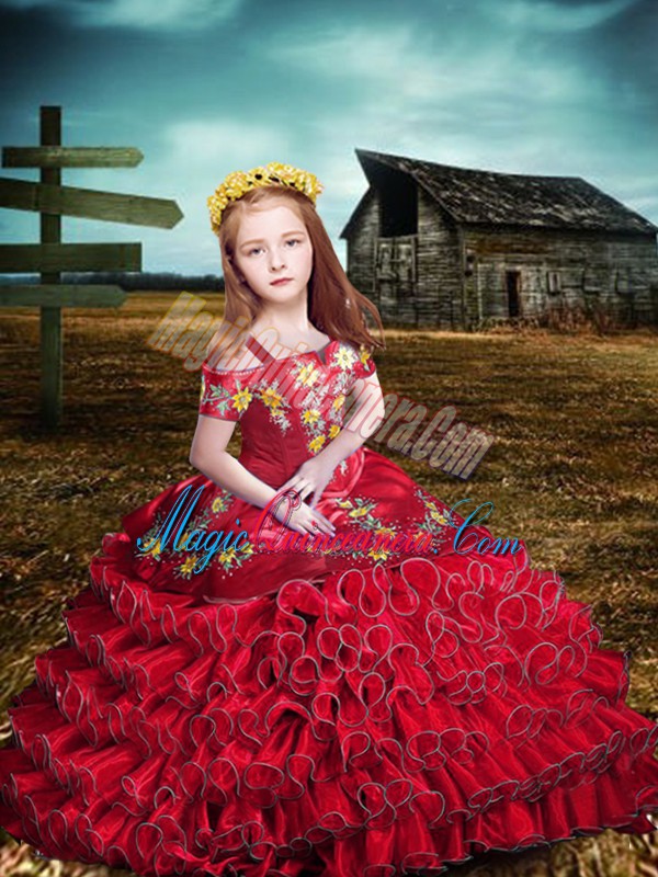 Red Lace Up Pageant Dress Womens Embroidery and Ruffled Layers Short Sleeves Floor Length