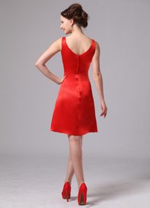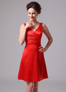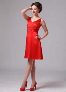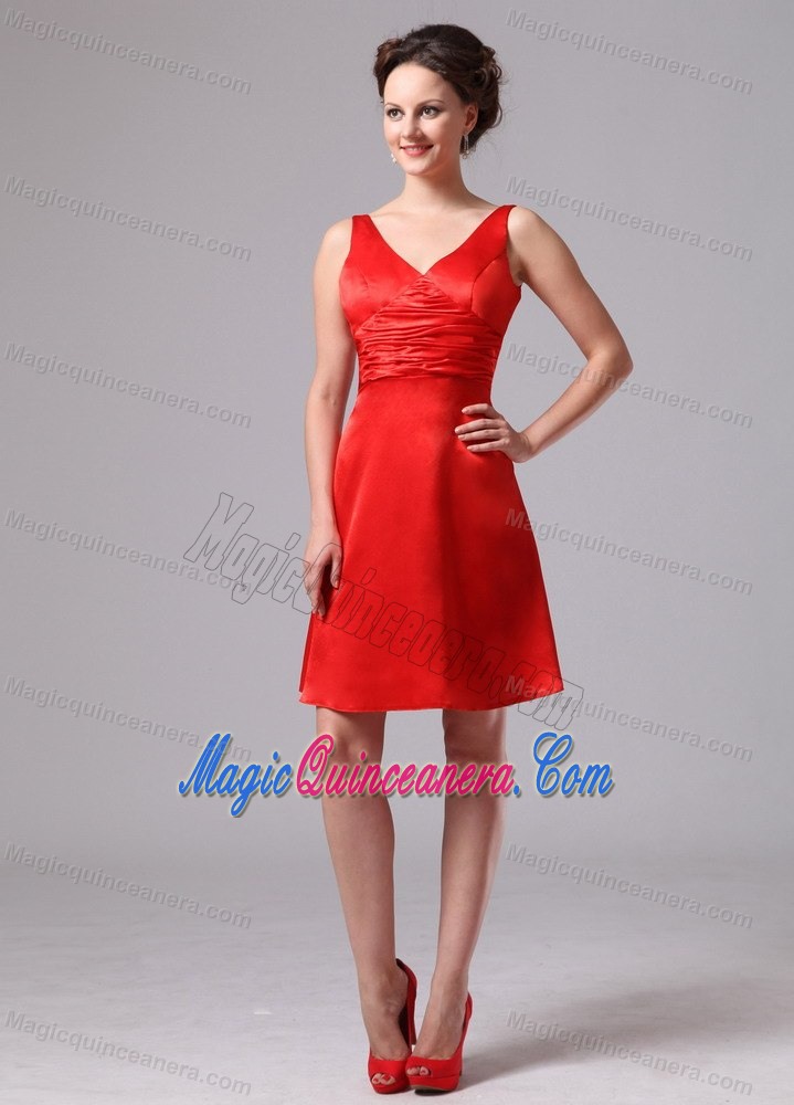 Red Ruched V-neck Knee-length Dama Dress For Custom Made