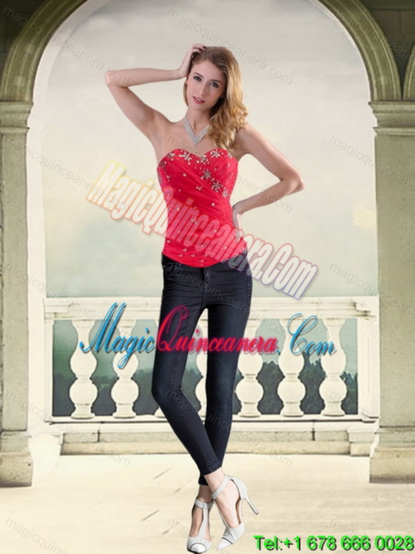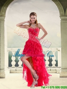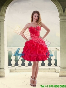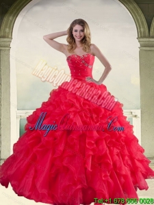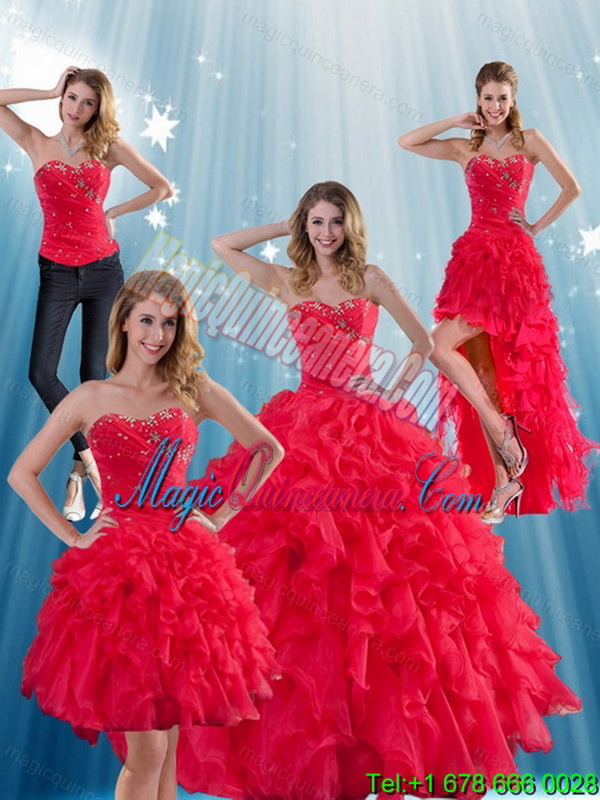 , Red Strapless Detachable Quinceanera Dress with Ruffles and Beading