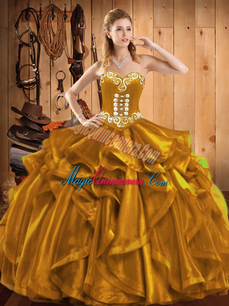 Romantic Floor Length Lace Up Quinceanera Gowns Gold for Military Ball and Sweet 16 and Quinceanera with Embroidery and Ruffles