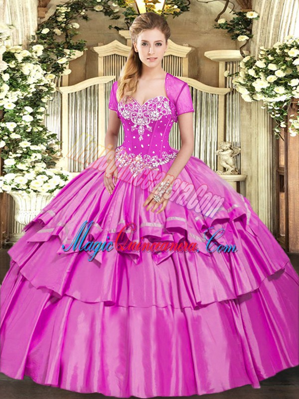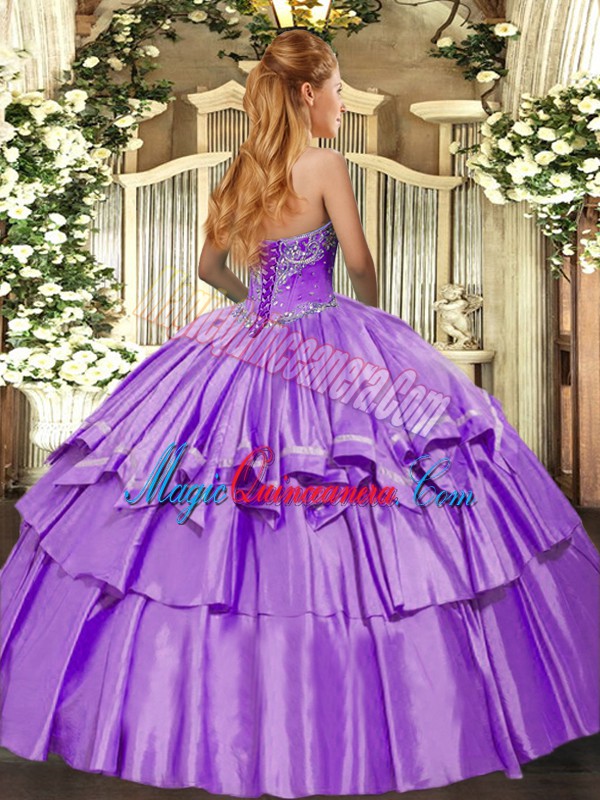 Romantic Lilac Organza and Taffeta Lace Up Sweetheart Sleeveless Floor Length Ball Gown Prom Dress Beading and Ruffled Layers