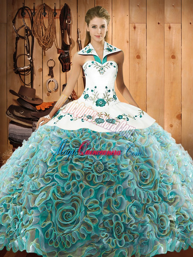 Romantic Multi-color Ball Gowns Fabric With Rolling Flowers Halter Top Sleeveless Embroidery Lace Up Sweet 16 Dresses Sweep Train