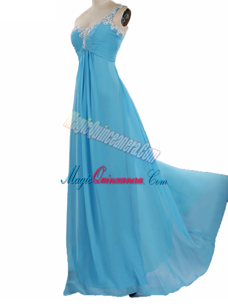 , Romantic One Shoulder Sleeveless Zipper Quinceanera Court Dresses Aqua Blue Chiffon