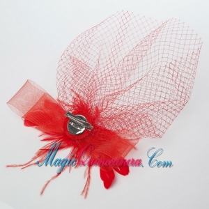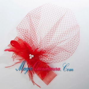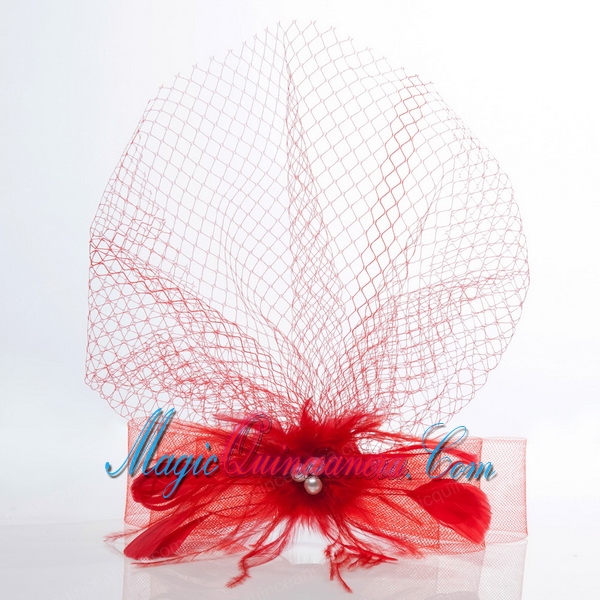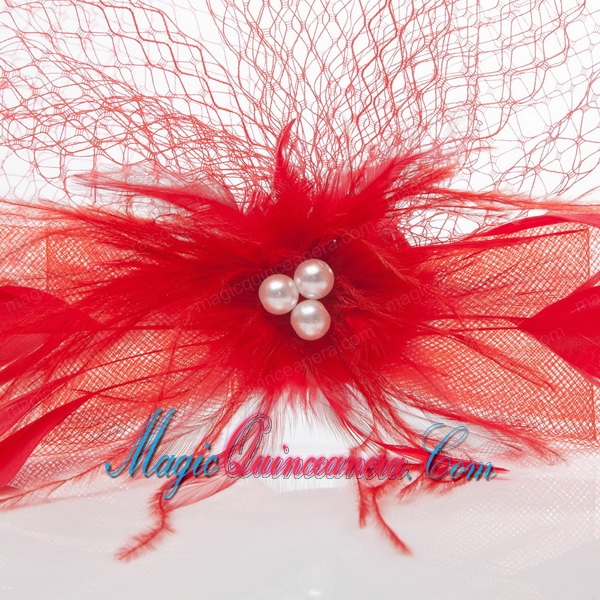 , Romantic Red Feather Net Yarn Briadl Hat with Imitation Pearls