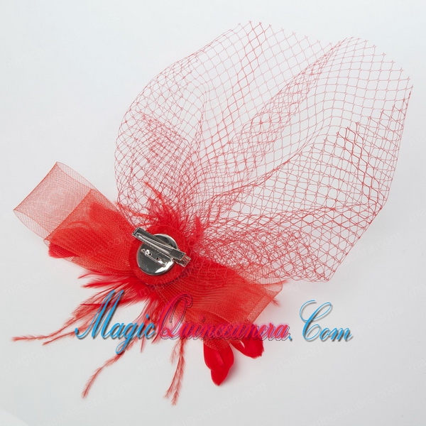 Romantic Red Feather Net Yarn Briadl Hat with Imitation Pearls