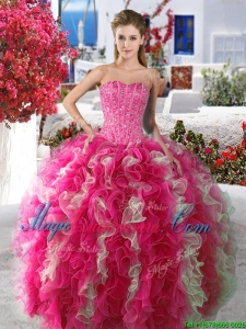 , Romantic Rose Pink and White Organza Quinceanera Dress with Beading and Ruffles