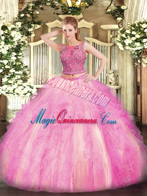 , Rose Pink Lace Up Scoop Beading and Ruffles Quinceanera Gown Tulle Sleeveless