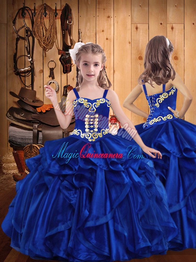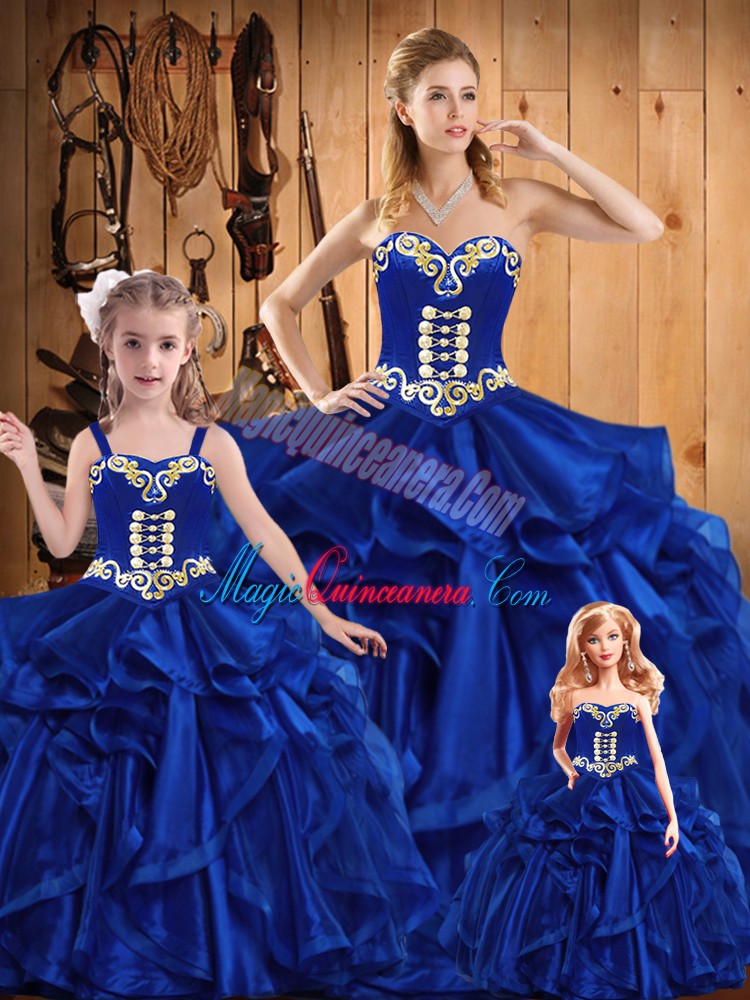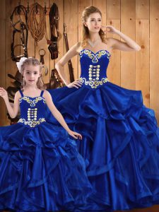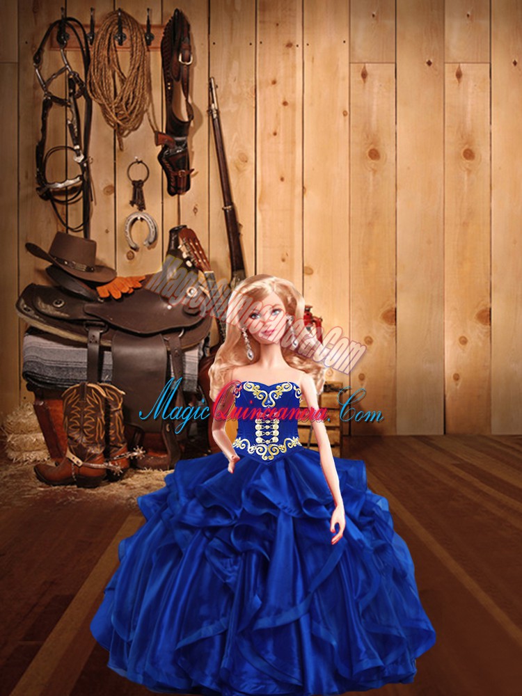 Royal Blue Ball Gowns Sweetheart Sleeveless Organza Floor Length Lace Up Embroidery and Ruffles 15th Birthday Dress