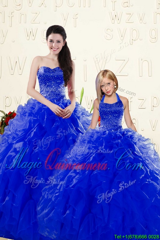 , Royal Blue Sleeveless Floor Length Beading and Ruffles Lace Up 15 Quinceanera Dress