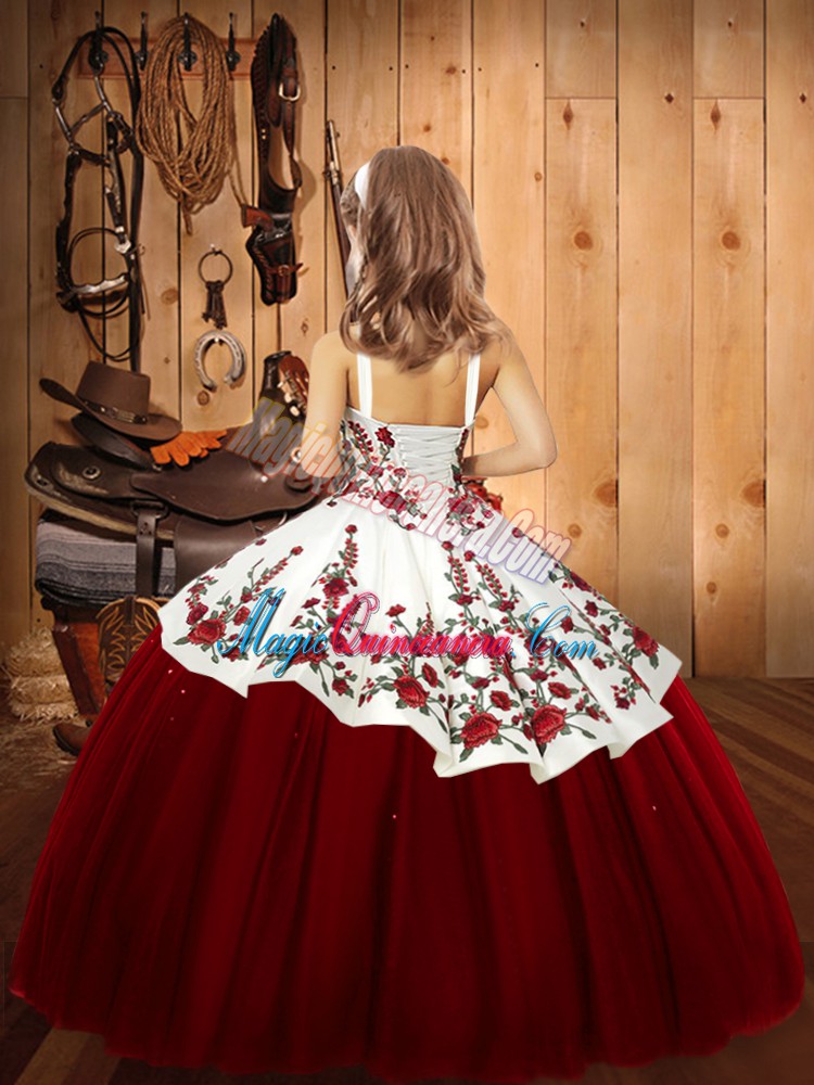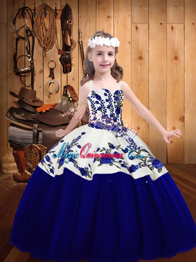 Royal Blue Straps Neckline Embroidery Girls Pageant Dresses Sleeveless Lace Up