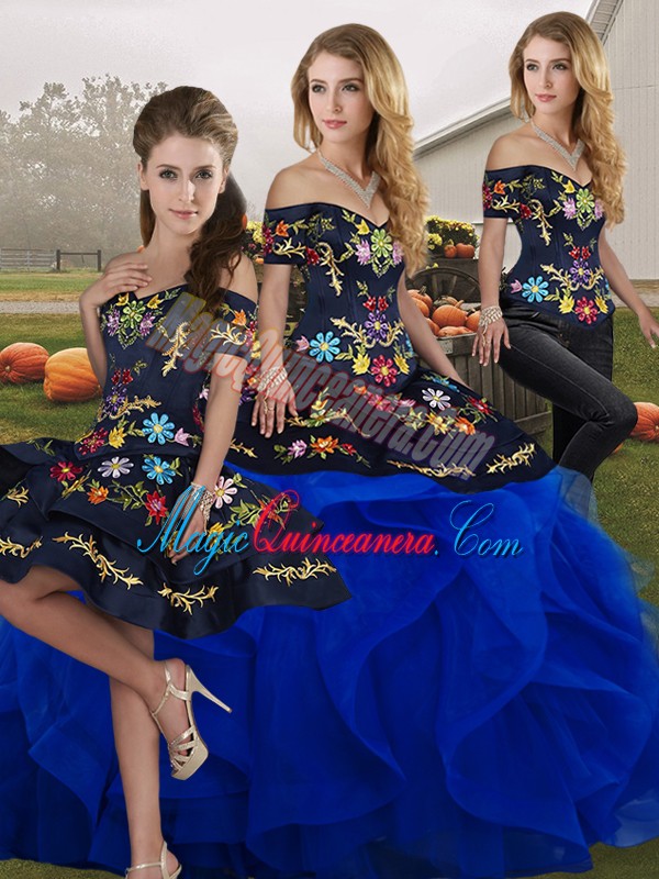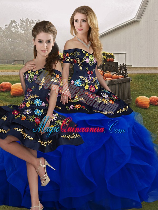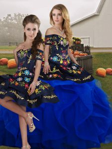 Royal Blue Tulle Lace Up Off The Shoulder Sleeveless Floor Length Quinceanera Dress Embroidery and Ruffles