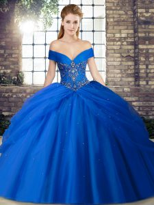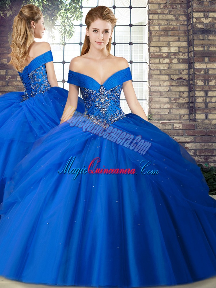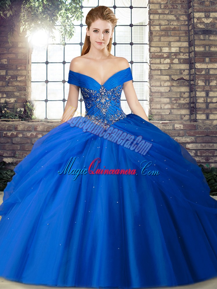 Royal Blue Tulle Lace Up Off The Shoulder Sleeveless Quinceanera Gowns Brush Train Beading and Pick Ups