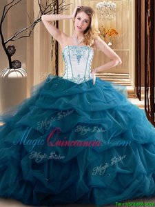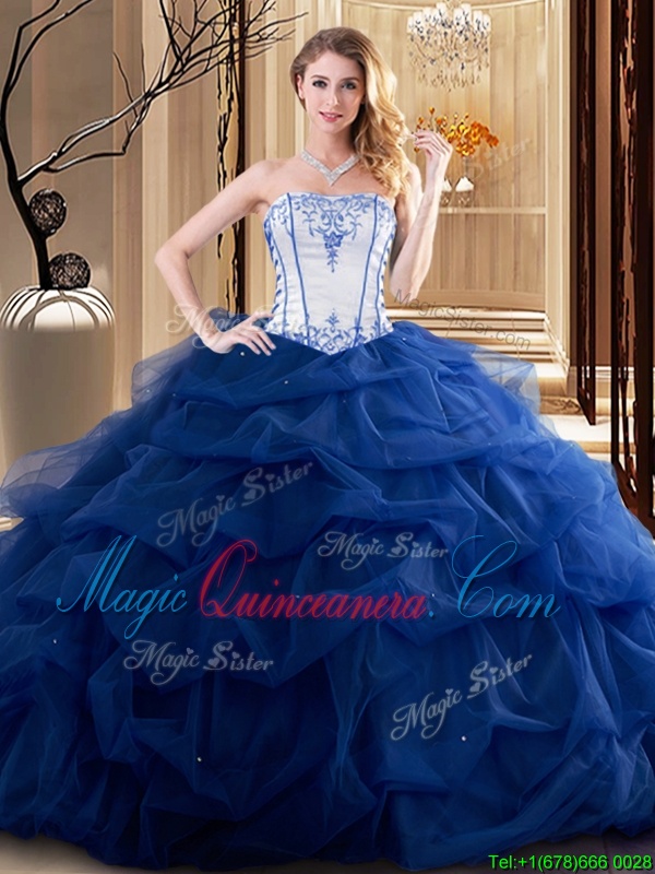 , Ruffled Floor Length Ball Gowns Sleeveless Blue And White Quince Ball Gowns Lace Up