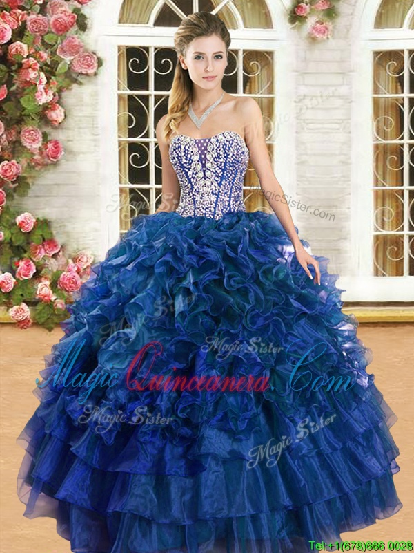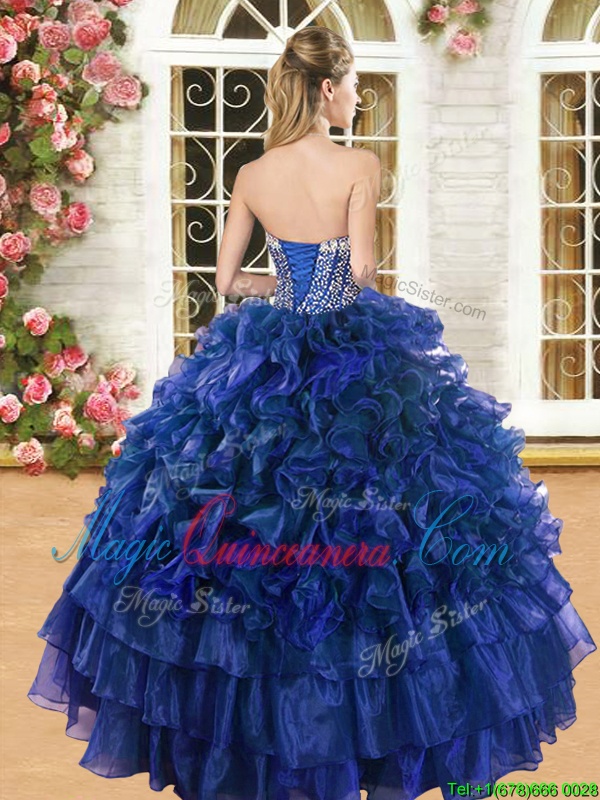 Ruffled Royal Blue Sleeveless Organza Lace Up 15th Birthday Dress for Military Ball and Sweet 16 and Quinceanera