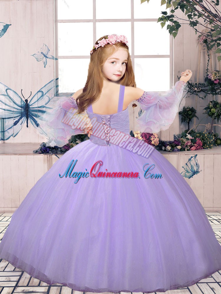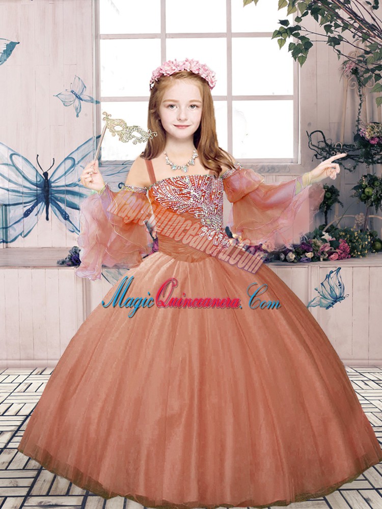 , Rust Red Lace Up Straps Beading Pageant Gowns For Girls Tulle Sleeveless