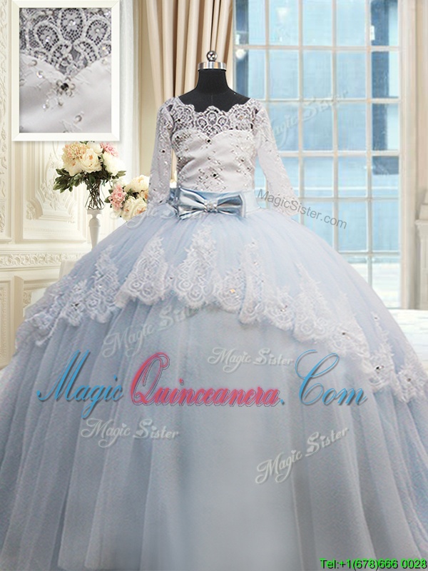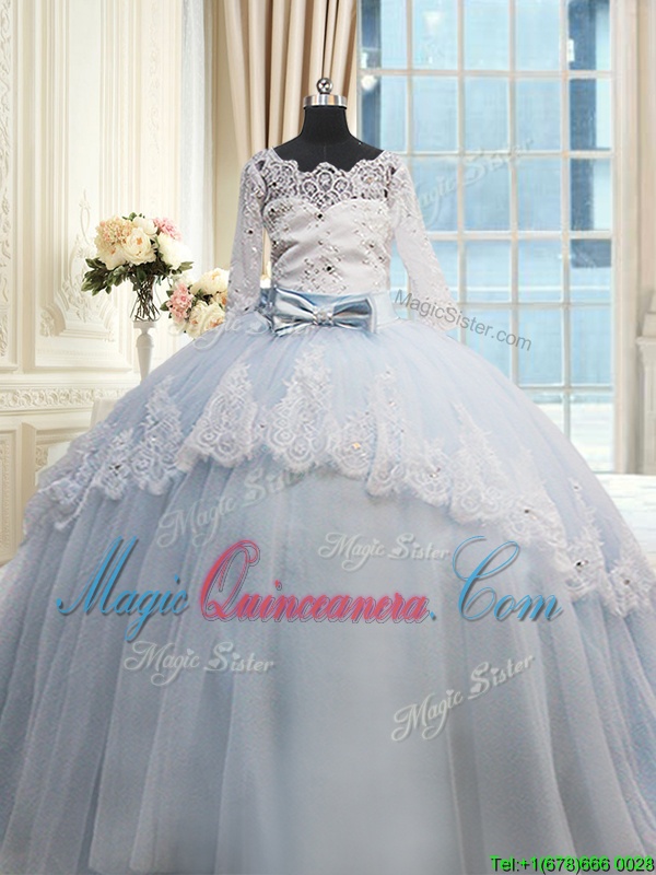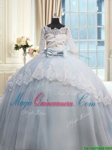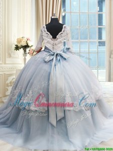 Scalloped Half Sleeves Beading and Lace and Bowknot Lace Up Quinceanera Gowns with Light Blue Brush Train