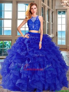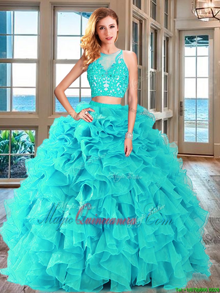 Scoop Aqua Blue Two Pieces Appliques and Ruffles Quinceanera Gowns Lace Up Organza Sleeveless Floor Length