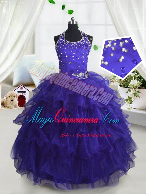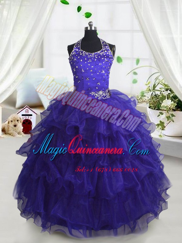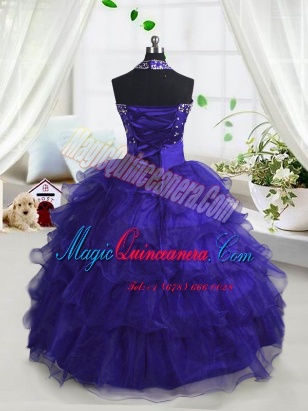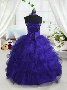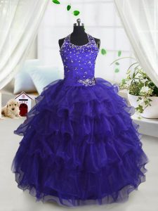 Scoop Beading and Ruffled Layers Glitz Pageant Dress Navy Blue Lace Up Sleeveless Floor Length