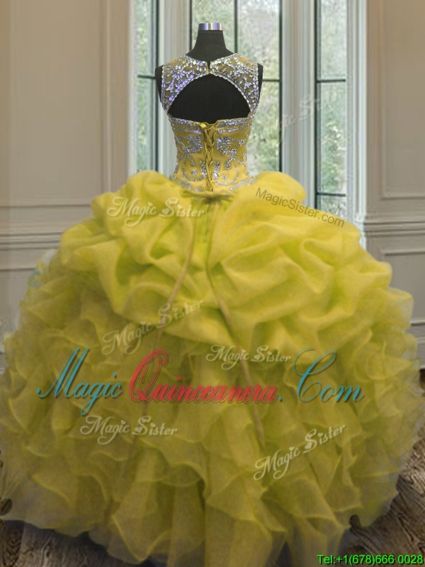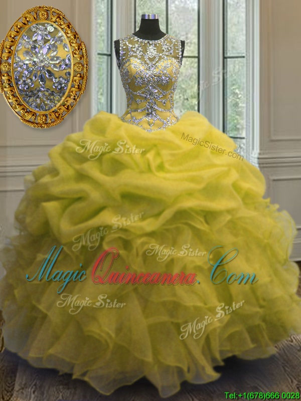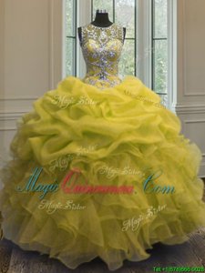 Scoop Floor Length Lace Up 15 Quinceanera Dress Yellow and In for Military Ball and Sweet 16 and Quinceanera with Beading and Ruffles and Pick Ups