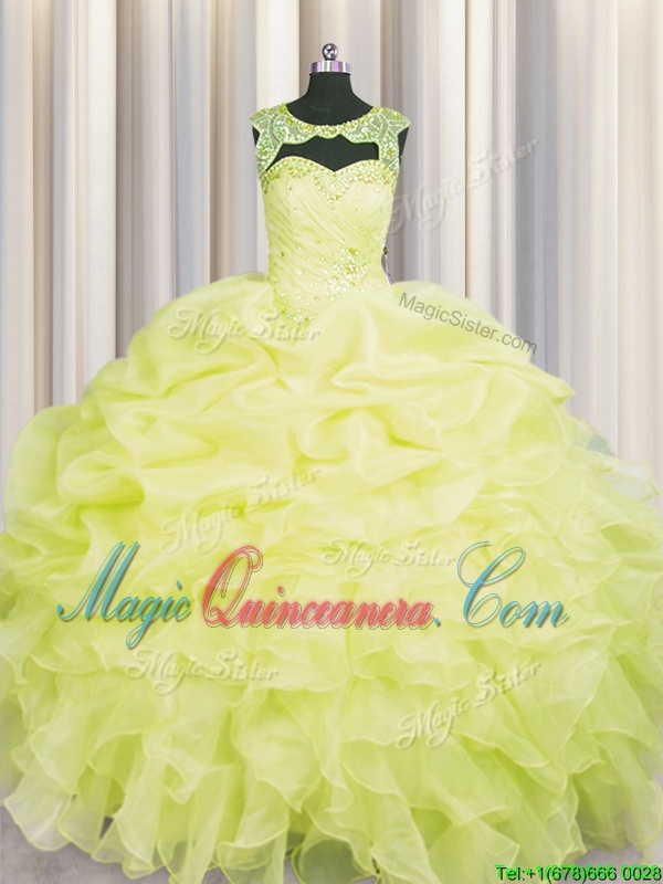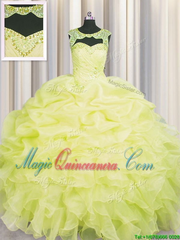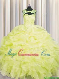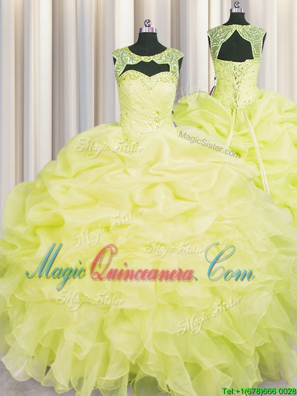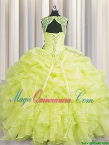 Scoop Floor Length Lace Up 15th Birthday Dress Yellow and In for Military Ball and Sweet 16 and Quinceanera with Beading and Pick Ups