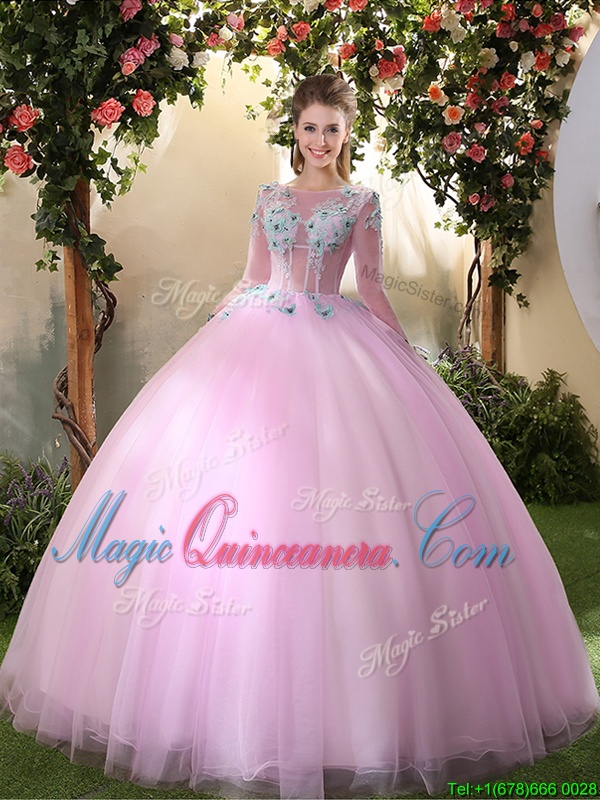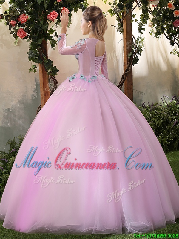 Scoop Floor Length Lilac 15 Quinceanera Dress Tulle Long Sleeves Appliques