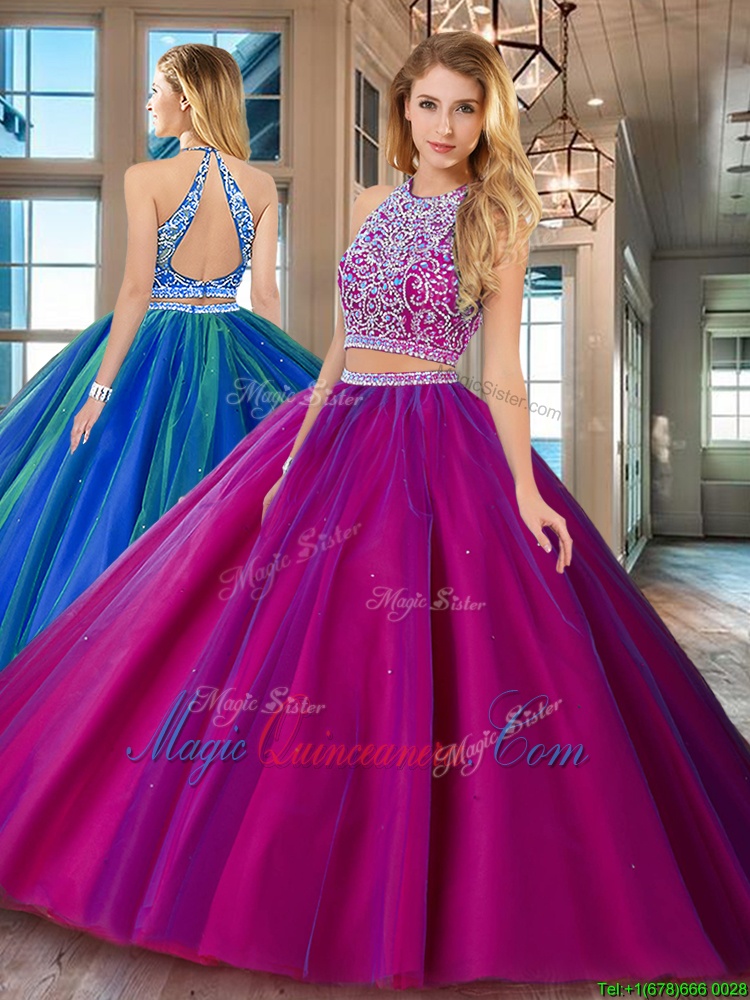 Scoop Floor Length Two Pieces Sleeveless Fuchsia Sweet 16 Quinceanera Dress Backless