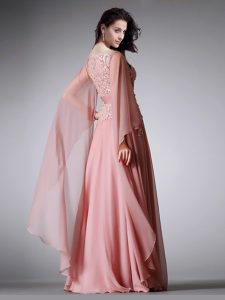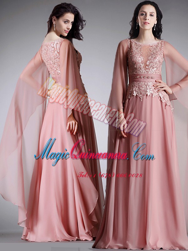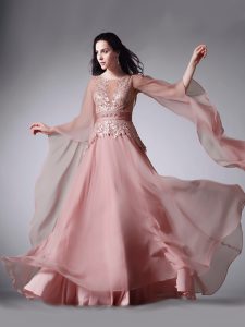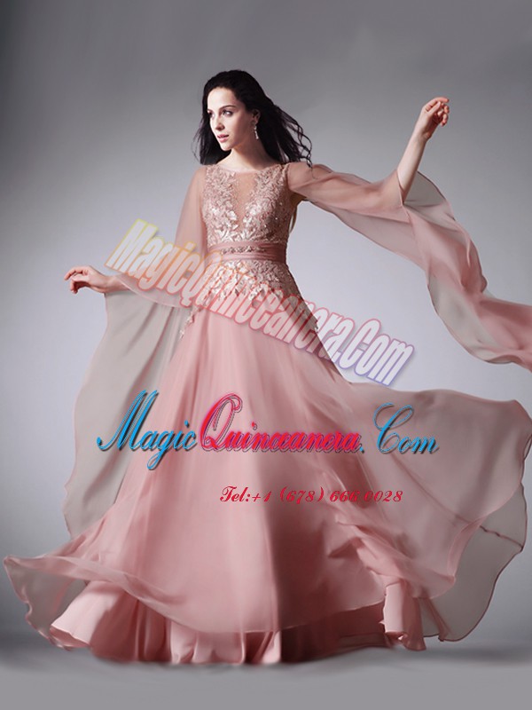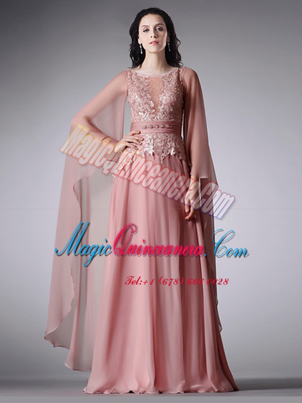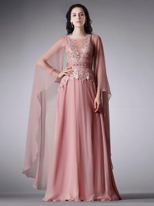 Scoop Floor Length Zipper Mother Of The Bride Dress Pink for Prom with Lace and Belt