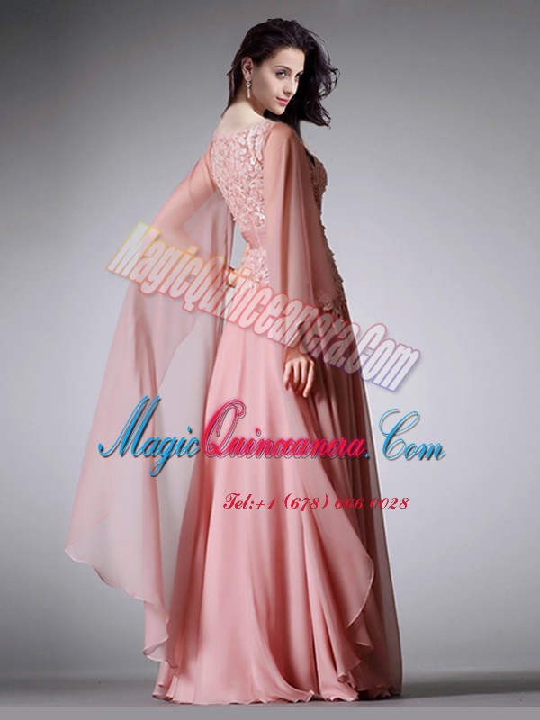 , Scoop Floor Length Zipper Mother Of The Bride Dress Pink for Prom with Lace and Belt