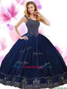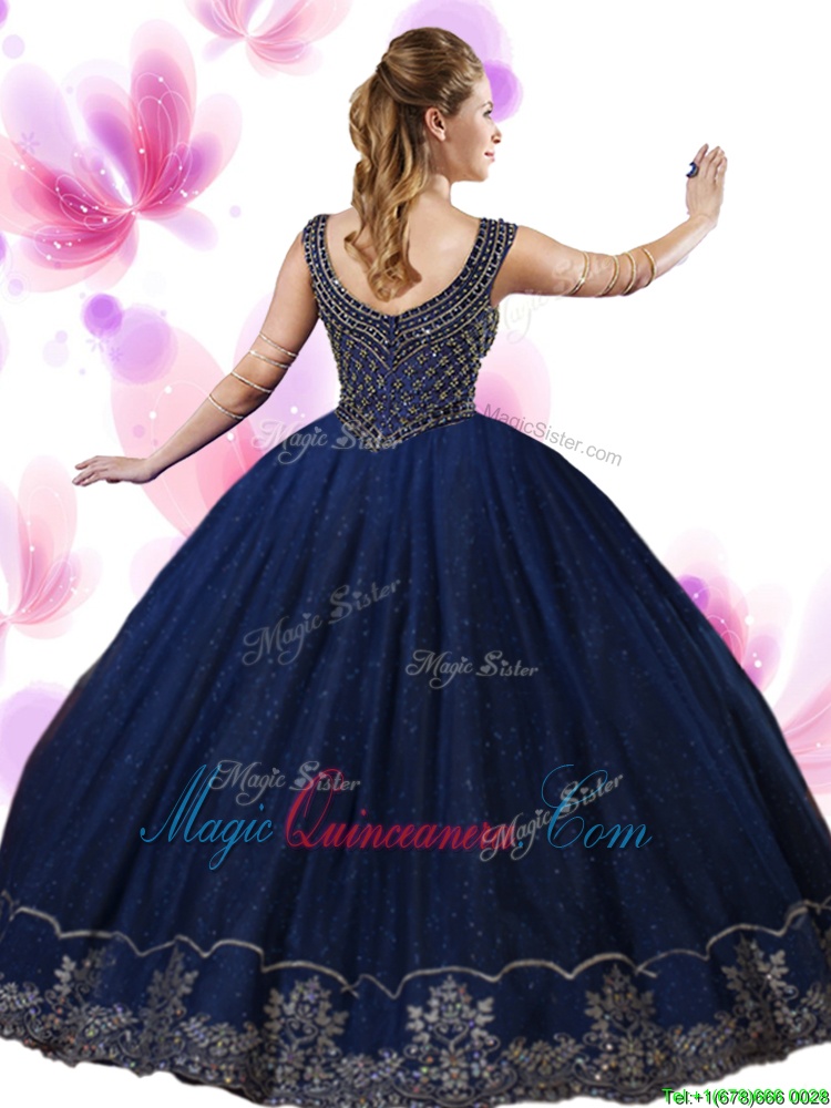 Super Scoop Floor Length Navy Blue Sweet 16 Dresses Tulle Sleeveless Beading