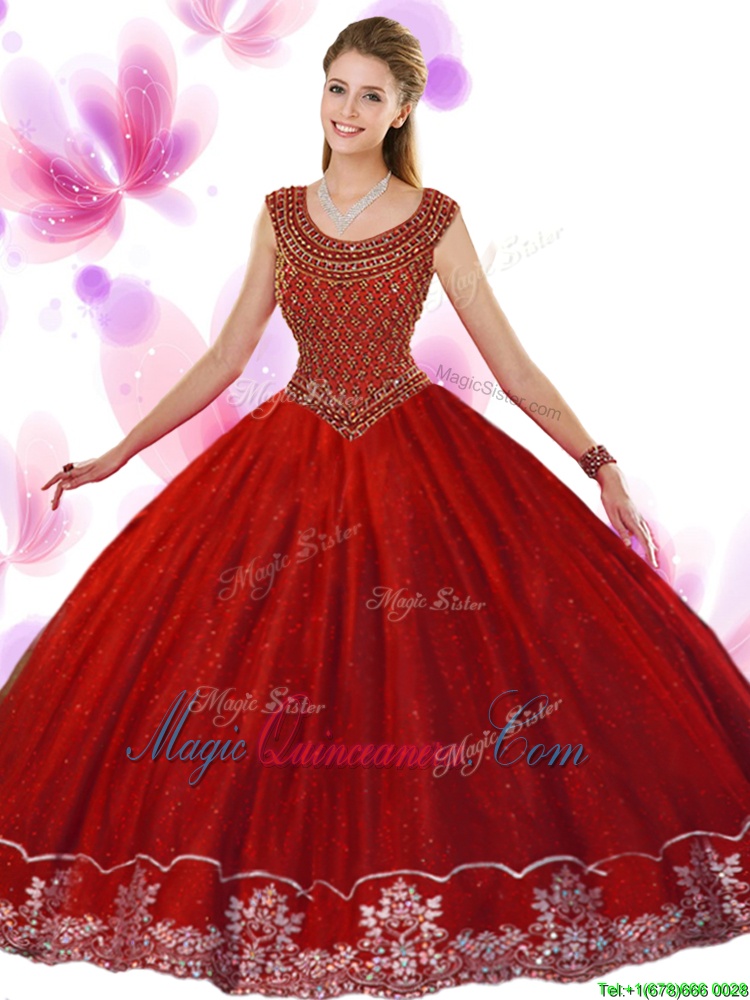 Scoop Floor Length Zipper Vestidos de Quinceanera Wine Red and In for Military Ball and Sweet 16 and Quinceanera with Beading and Appliques