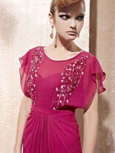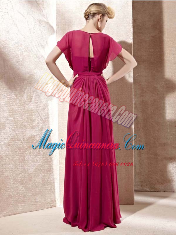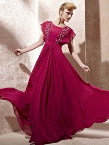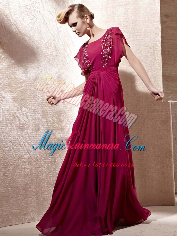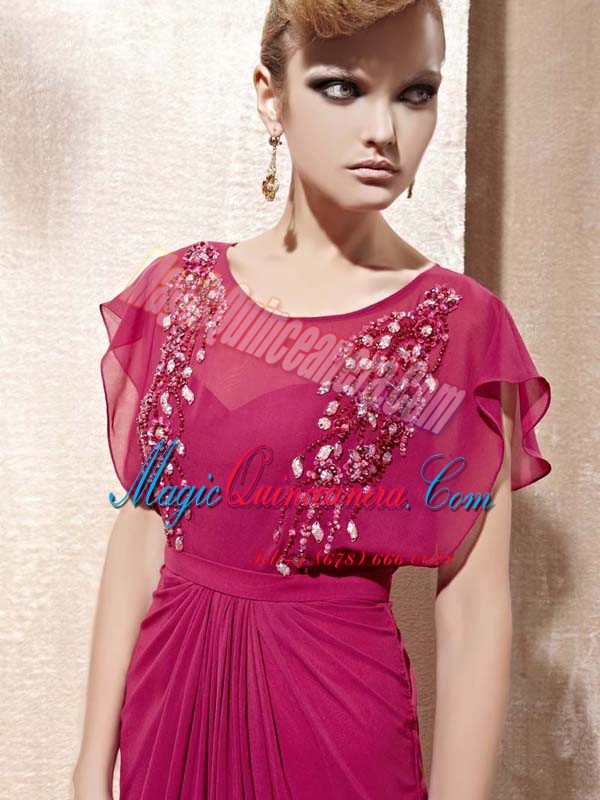 , Scoop Fuchsia Chiffon Zipper Homecoming Dress Cap Sleeves Floor Length Beading