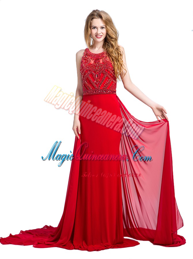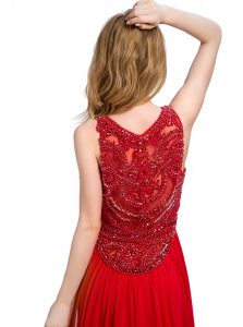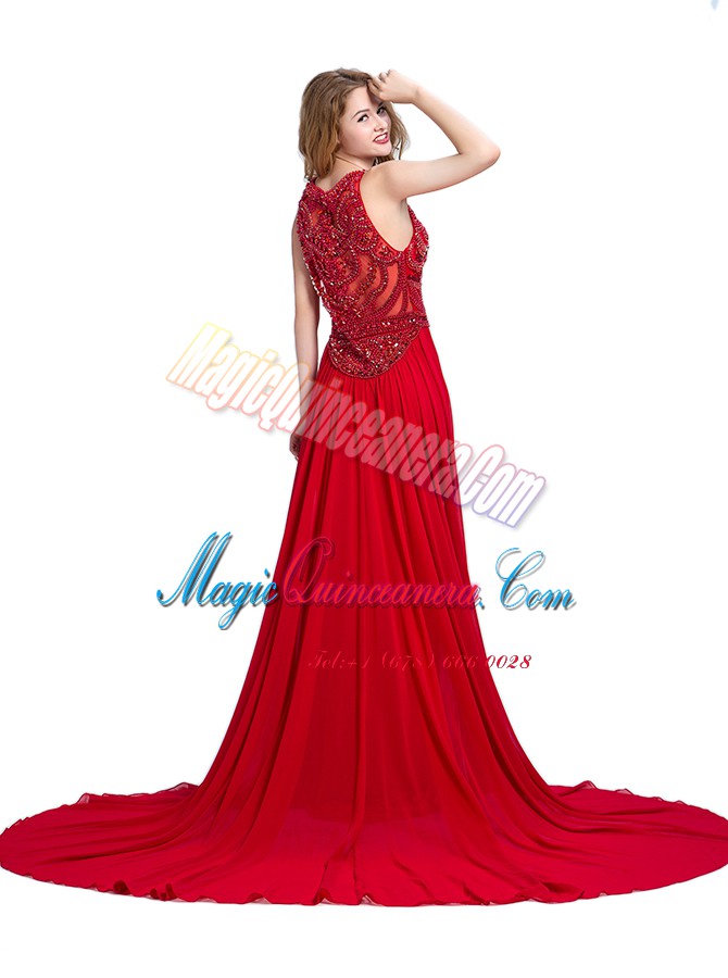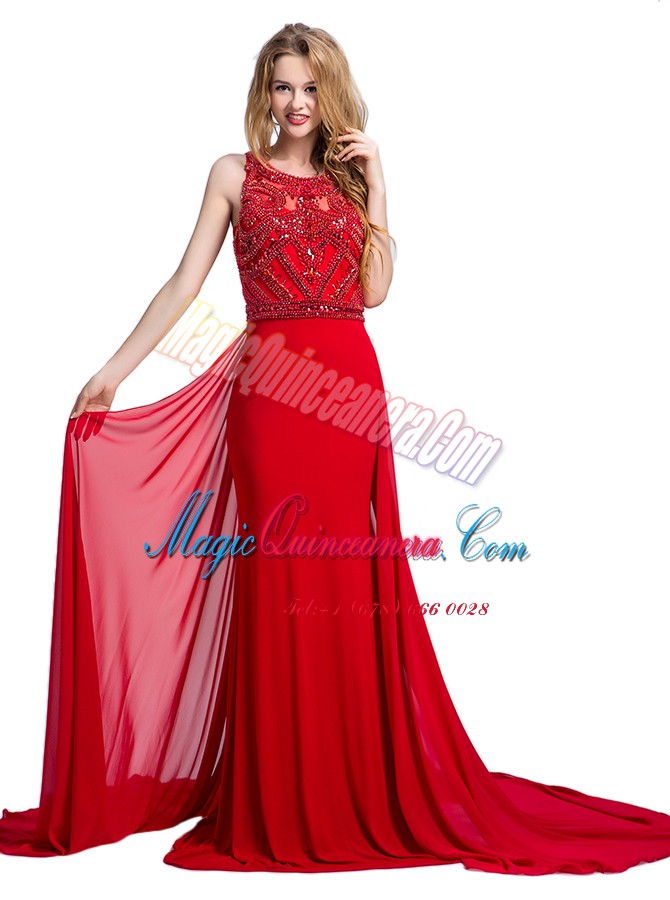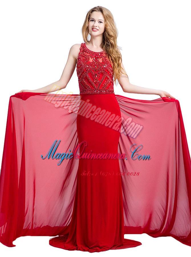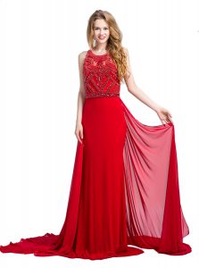 Scoop Red Silk Like Satin Zipper Prom Gown Sleeveless With Train Court Train Beading