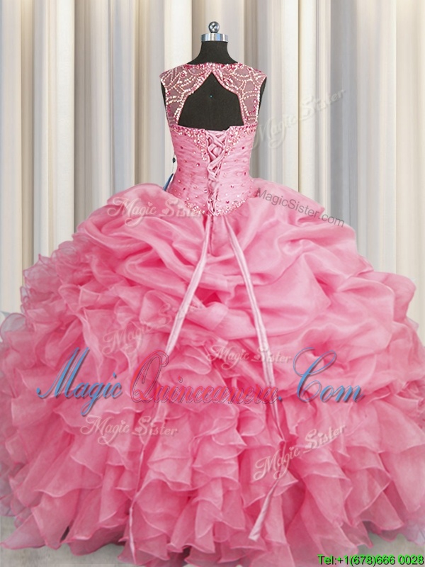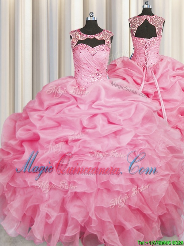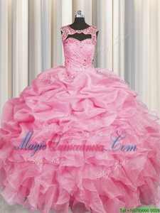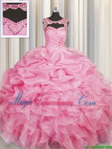 Scoop Rose Pink Lace Up Quinceanera Gowns Beading and Pick Ups Sleeveless Floor Length