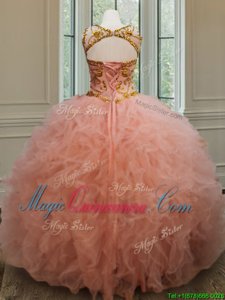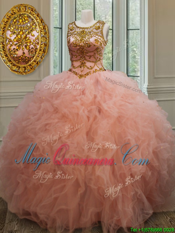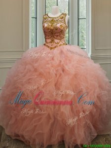 Scoop See Through Peach Sleeveless Tulle Lace Up Ball Gown Prom Dress for Military Ball and Sweet 16 and Quinceanera