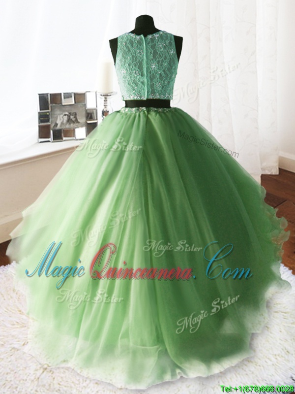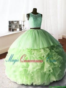 , Scoop Sleeveless Brush Train Zipper Quince Ball Gowns Organza and Tulle and Lace