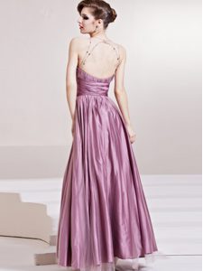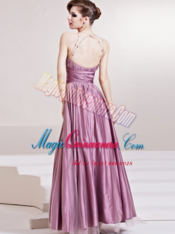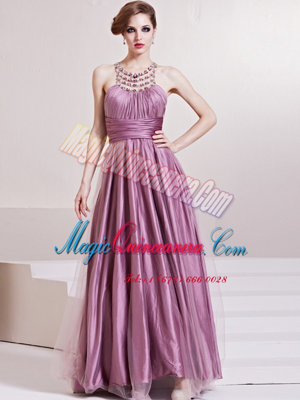 , Scoop Sleeveless Floor Length Beading and Ruching Zipper Prom Gown with Lilac