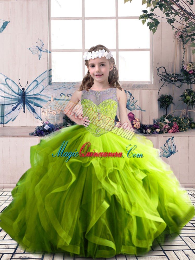 , Scoop Sleeveless Lace Up Little Girls Pageant Dress Wholesale Olive Green Tulle